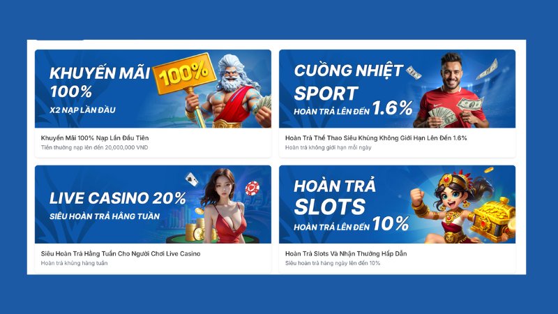 • Không giới hạn đối tượng: Dù bạn là tân binh hay thành viên lâu năm, nhà cái đều đem tới những ưu đãi phù hợp. Từ thưởng đăng ký, nạp lần đầu đến hoàn trả và quà tặng VIP. Ai cũng có cơ hội nhận thưởng!